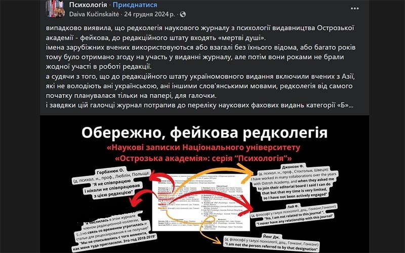 За словами Дайви, вона «випадково виявила, що редколегія наукового журналу з психології видавництва Острозької академії – фейкова, до редакційного штату входять “мертві душі”».