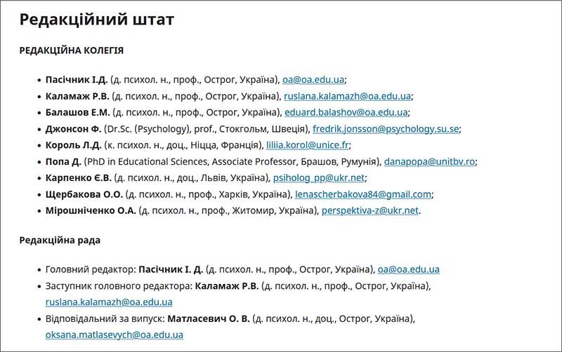 Станом на березень 2025-го до редколегії «Наукових записок» з психології входило дев’ятеро людей. Серед них – п’ять іноземців.
