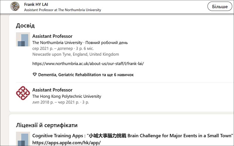Так, докторка Фейфей Хан із Австралії перейшла з Університету Гриффіта в Австралійський католицький університет. Доктор Френк Лай тепер не в Гонконзі, а в Англії – в Нортумбрійському університеті.