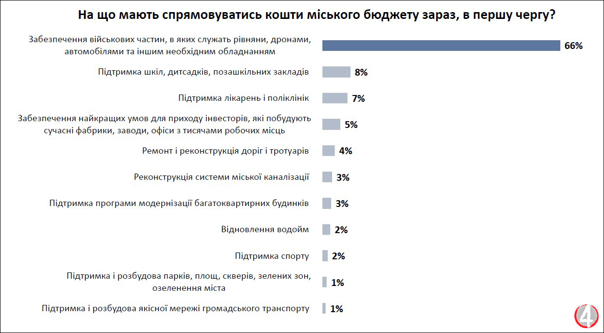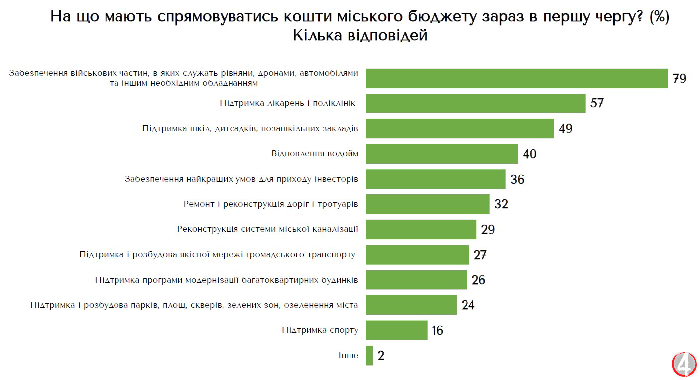 Як ми і припускали, більшість опитаних (66%) вважали, що в першу чергу слід спрямовувати гроші на забезпечення військових частин, в яких служать рівняни, дронами, автомобілями та іншим необхідним обладнанням.