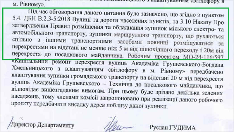 У відповіді керівник департаменту посилається на засідання Координаційної ради з питань безпеки дорожнього руху міста Рівного, до якого входять і представники поліції. Цитує Державні будівельні норми (ДБН) та Наказ «Про затвердження Правил розміщення та обладнання зупинок міського електро- та автомобільного транспорту».