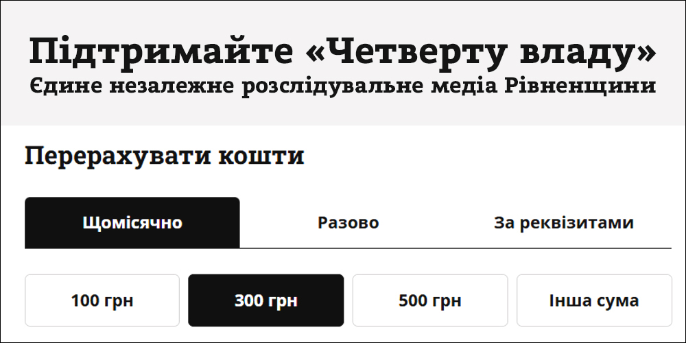 Якщо підтримали Сили оборони і хочете, щоб онлайн-медіа «Четверта влада» продовжувало працювати на Рівненщині – ставайте щомісячними підписниками хоча б на 20 гривень: