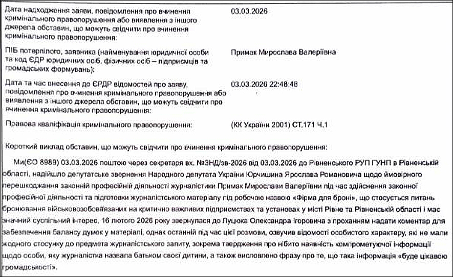 Розмова із Олександром Луцюком відбулася 16 лютого, тоді ж «Четверта влада» і опублікувала її переказ. 25 лютого Мирослава Примак подала заяву до поліції. Там не реагували, допоки не втрутився голова комітету Верховної Ради з питань свободи слова Ярослав Юрчишин.