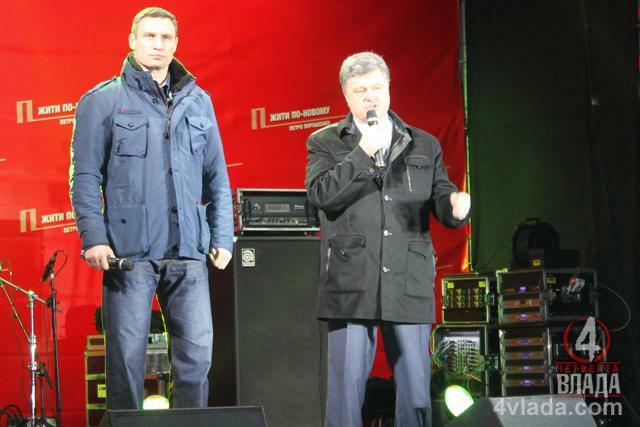 Потім шаблонні ведучі оголосили прихід на сцену Віталія Кличка та Петра Порошенка. Політики проходили через людей, тиснучи їм руки і ледь не обіймаючись.
