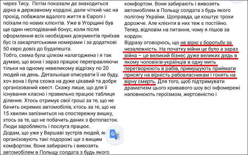У цьому бізнесі, пише Валерій, «чоловіків-українців в одну мить перетворюють на рабів, примушують приймати присягу на вірність рабовласникам і гонять на вірну смерть».