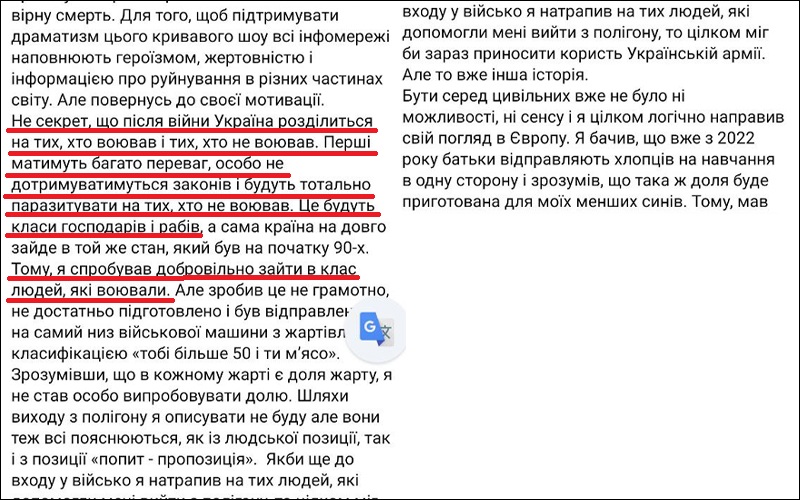«Не секрет, що після війни Україна розділиться на тих, хто воював і тих, хто не воював. Перші матимуть багато переваг, особо не дотримуватимуться законів і будуть тотально паразитувати на тих, хто не воював.