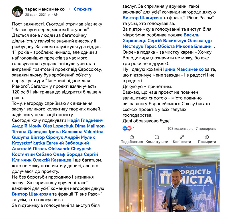Попри те, що запуск проєкту переносився, у 2021 році Максименка нагородили відзнакою «За заслуги перед містом» IІ ступеня. Як зазначено у рішенні, «за багаторічну плідну працю, діяльність у певній галузі, що сприяла підвищенню її авторитету, престижу, за тривалі зусилля, що увінчалися успіхом». Нагородили Максименка як керівника проєкту «Таємничі підземелля Рівного. Культурна спадщина як елемент інтерактивного вивчення історії краю».