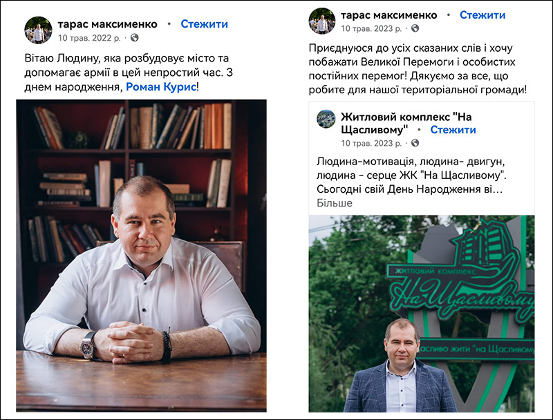 Місце роботи в торговельно-розважальному центрі, схоже, не випадкове, адже фірма належить Олені та Роману Курисам. Курис, як писали медіа у 2020 році, думав балотуватись на посаду міського голови Рівного, тоді в його оточенні з’явився і Тарас Максименко. Але натомість висунули кандидатуру Віктора Шакирзяна, чиїм помічником-консультантом нині працює Тарас Максименко.