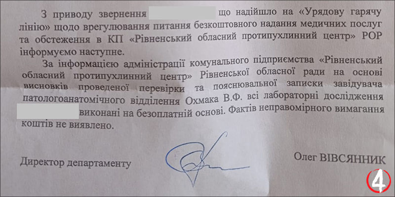 Улітку ж, перед тим, як забрати результати гістології, чоловік зателефонував до Департаменту цивільного захисту й охорони здоров’я Рівненської обласної державної адміністрації за телефоном цілодобового кол-центру 067 494 51 25. Запитав, чи потрібно платити за гістологію.