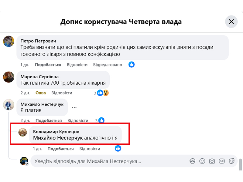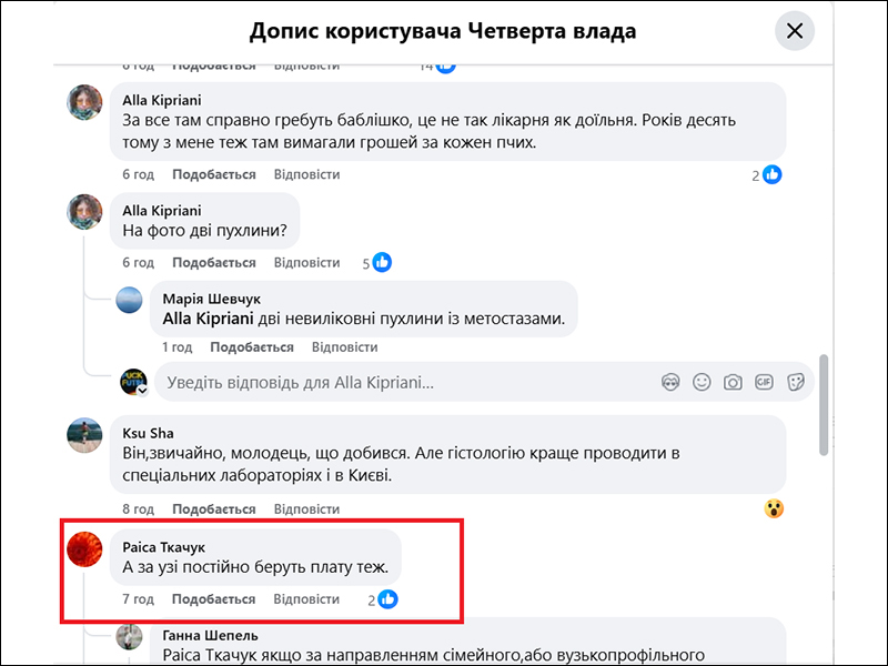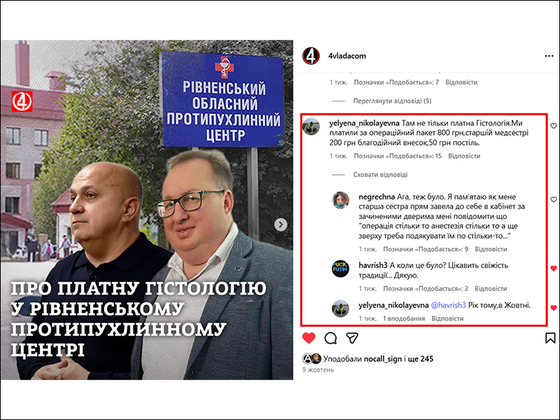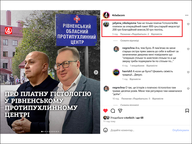- «Там не тільки платна гістологія. Ми платили за операційний пакет 800 грн, старшій медсестрі 200 грн благодійний внесок, 50 грн — постільна білизна», – це коментар під інстаграм-публікацією того ж матеріалу»;