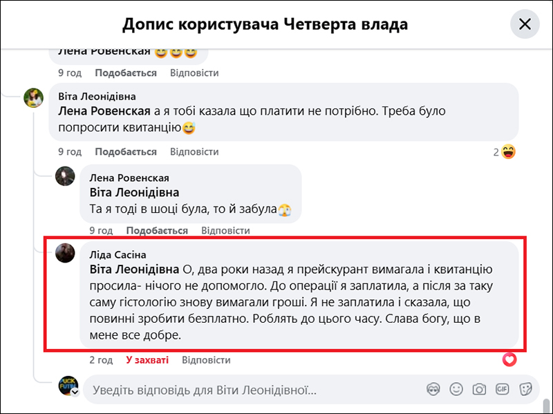 - «О, два роки назад я прейскурант вимагала і квитанцію просила – нічого не допомогло. До операції я заплатила, а після за таку саму гістологію знову вимагали гроші. Я не заплатила і сказала, що повинні зробити безоплатно. Роблять до цього часу. Слава богу, що в мене все добре»;