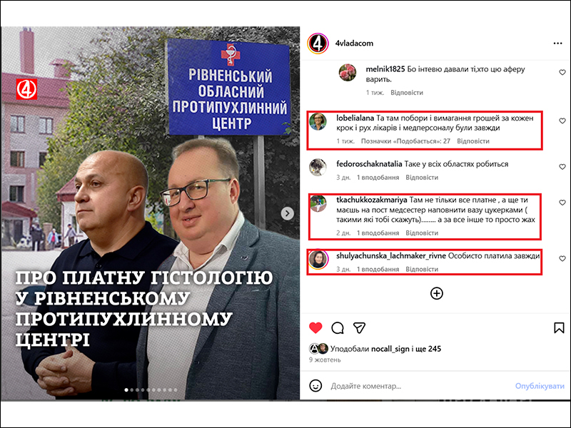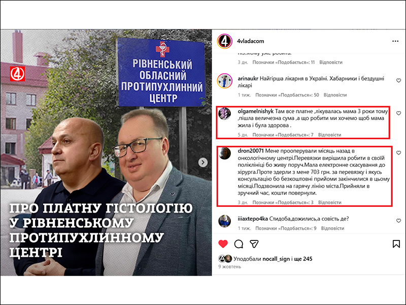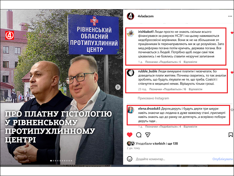 І у фейсбуці і в інстаграмі матеріал отримав активні відгуки наших читачів. Люди розповіли про свої досвіди оплат за медичні послуги в протипухлинну центрі: