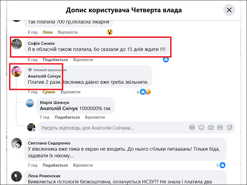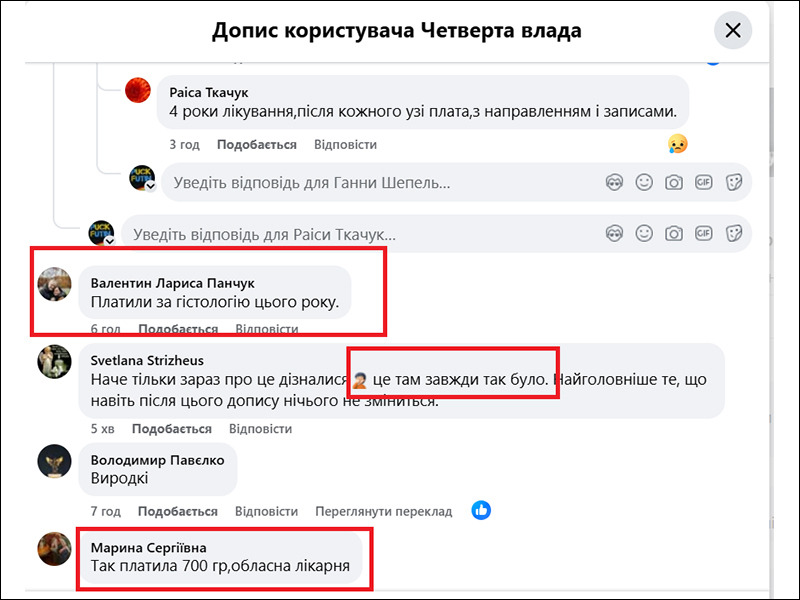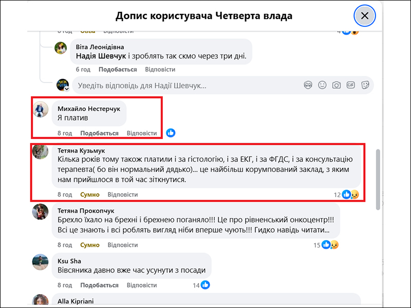 Так читачі «Четвертої влади» відреагували у фейсбуці на нашу публікацію про платну гістологію у Рівненському обласному протипухлинному центрі. Гістологія ж належить до безоплатних медичних послуг, бо входить до договору з Національною службою здоров’я (НСЗУ).