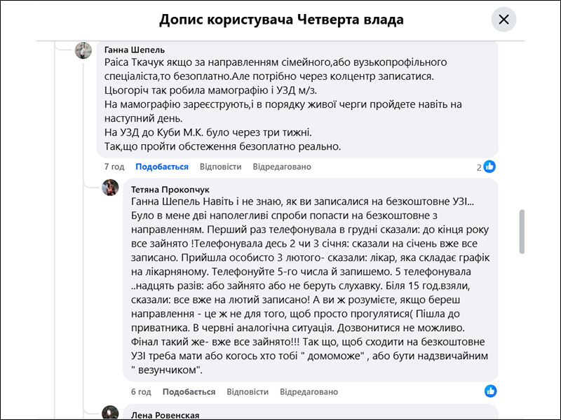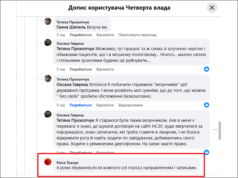 - «4 роки лікування, після кожного УЗД плата, з направленням і записами»;