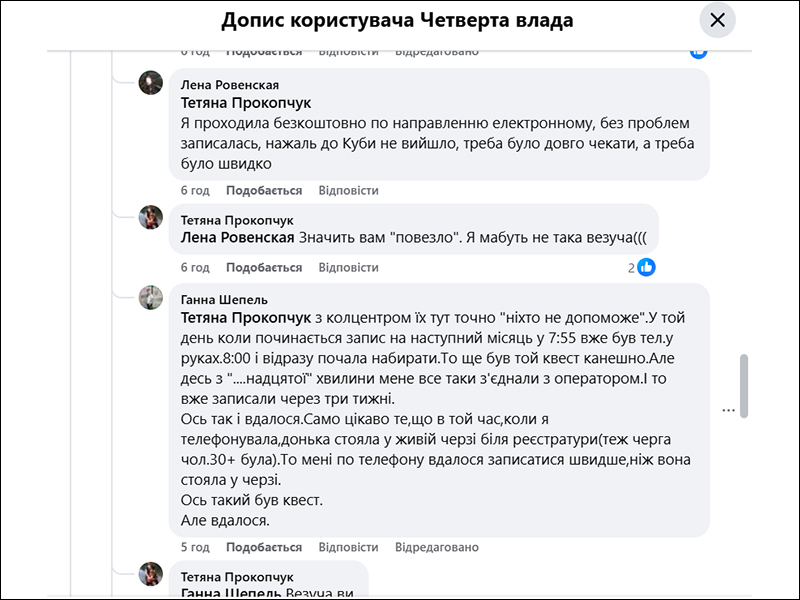 - «Випишуть таку жовту совдепівську ще (ймовірно, мова про паперове направлення на медпослугу, яке не фіксується в електронній системі охорони здоров’я. – Авт.), а що людина у такому стані розуміє. Потім читаєш і диву даєшся, який цинізм. Ба більше: не заплатиш, скажуть: “Їдь у Київ, заплатиш ще більше”. А тут болить»;