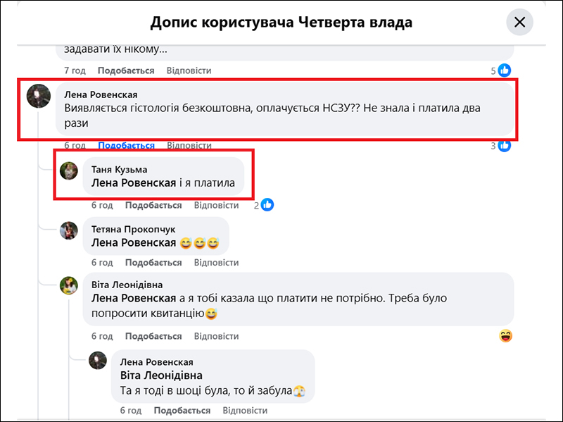 - «Виявляється, гістологія безкоштовна, оплачується НСЗУ? Не знала і платила два рази»;
