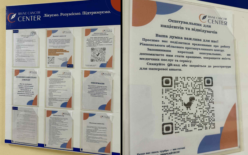 Також адміністрація звертає увагу пацієнтів на к’юар-код, який можна побачити роздрукованим при вході в заклад. Цей код переводить на форму відгуку про перебування в протипухлинному.