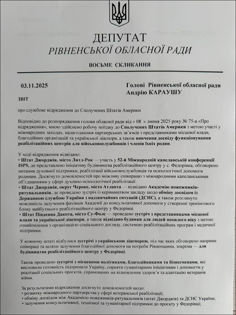 Із 17 липня по 7 серпня 2025 року секретар постійної комісії обласної ради з питань будівництва, розвитку інфраструктури та місцевого самоврядування, депутат від «Батьківщини» Микола Добриднік, який працює директором комунального закладу «Рівненський психоневрологічний інтернат» Рівненської обласної ради, був у США за запрошенням неприбуткової благодійної організації «Global Christian Support Inc».